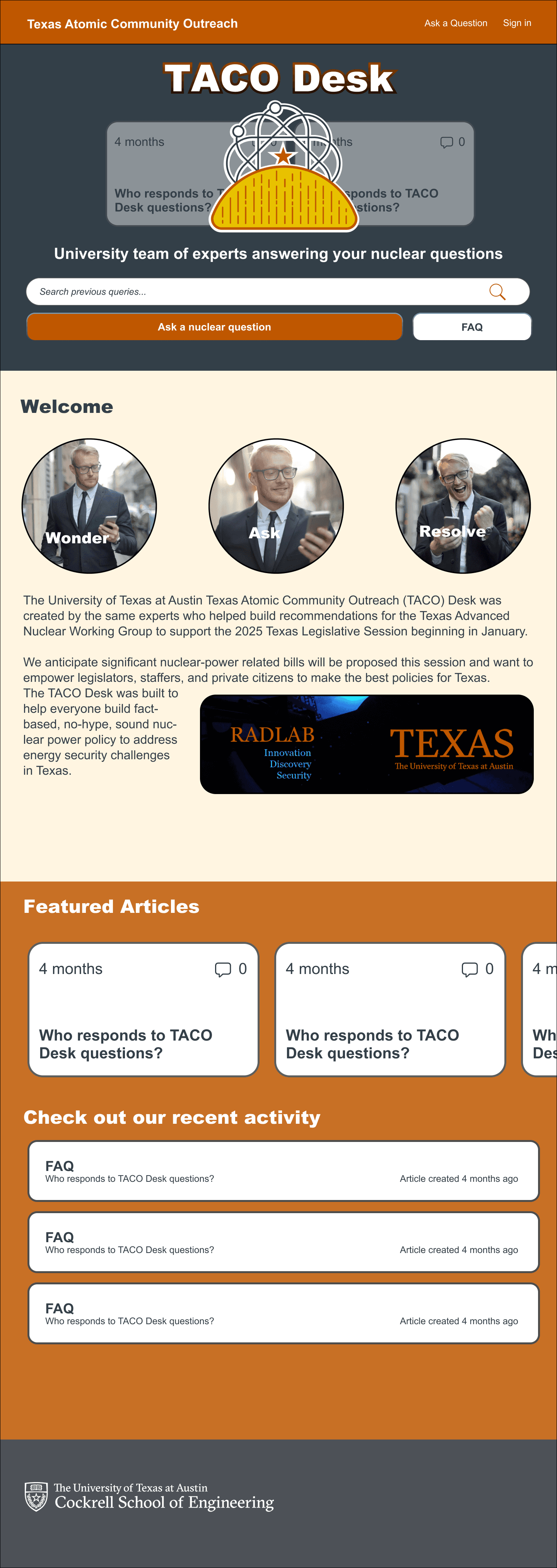 Incorporate TACO branding into the design for trust and recognition (this included creating TACO oriented assets in addition to the existing UT Cockrell School of Engineering brand book)